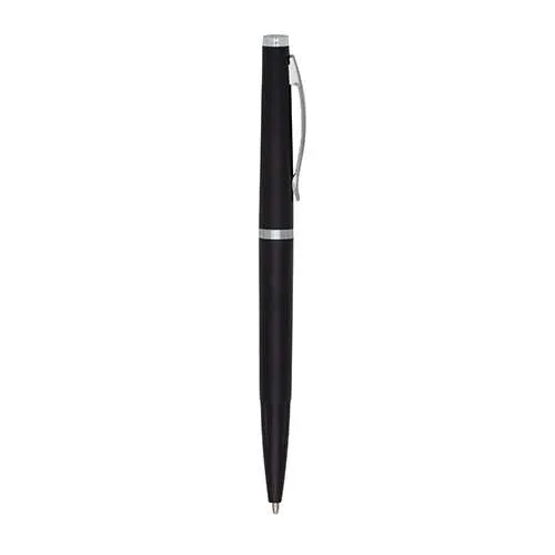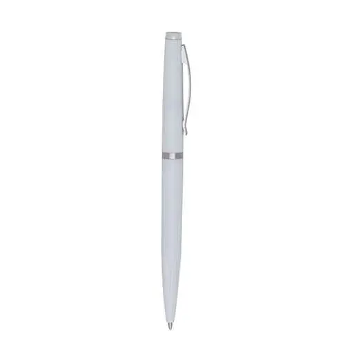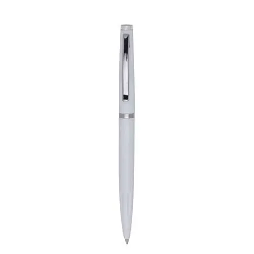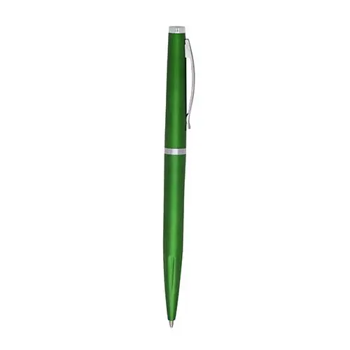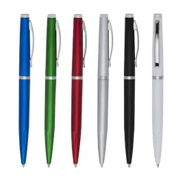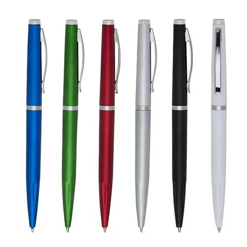Caneta plástica com design fino, corpo colorido e detalhes em prata. Possui o clip em metal e parte inferior com relevo, aciona por giro.