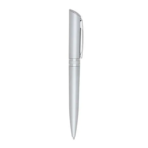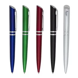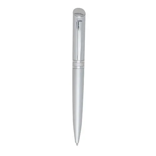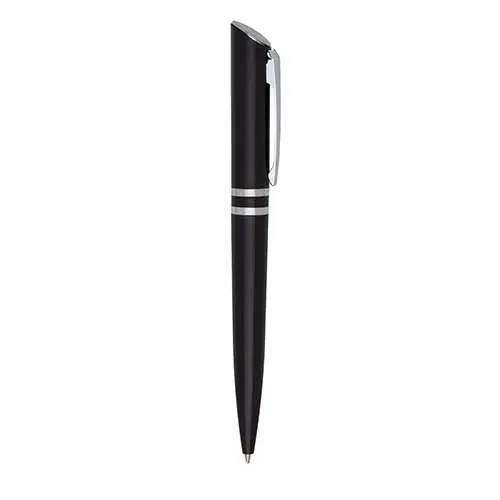 Caneta plástica inteira colorida com detalhes em prata. Clip de metal, possui dois aneis prata no centro. Aciona por clique.