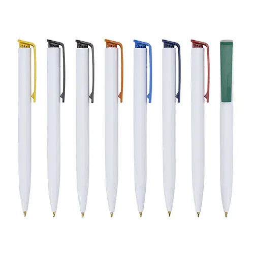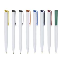 Descrição: Caneta plástica inteira branca leitosa com o clip colorido. Aciona por clique.