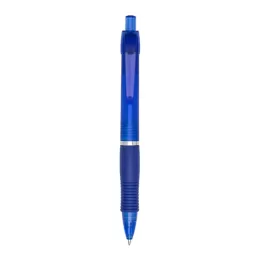 Caneta plástica inteira colorida com anel prata. Possui corpo translúcido e parte inferior emborrachada com relevo. Aciona por clique.