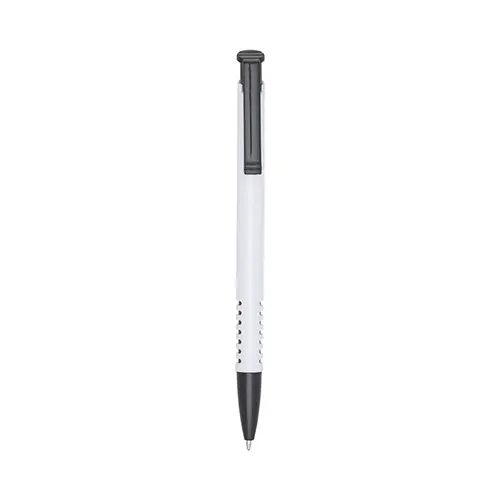 Caneta plástica corpo branco com detalhes coloridos. Clip plástico colorido e parte inferior com sete linhas coloridas. Aciona por clique.