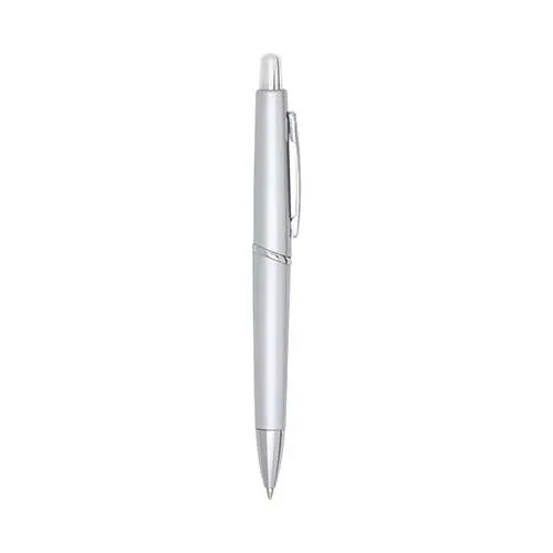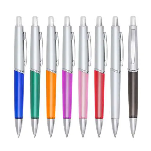 Caneta plástica inteira colorida com detalhes prata. Possui clip de metal com detalhe plástico preto, parte inferior com três anéis coloridos. Aciona por clique.