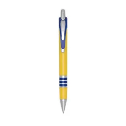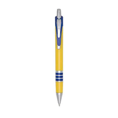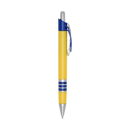 Caneta plástica inteira amarela com detalhes coloridos. Possui clip de metal com detalhe plástico colorido, parte inferior com três anéis coloridos. Aciona por clique.
