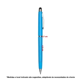 Descrição: Caneta plástica touch screen com acionamento por rotação e carga esferográfica azul 1mm.