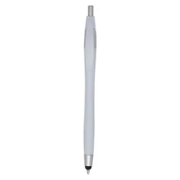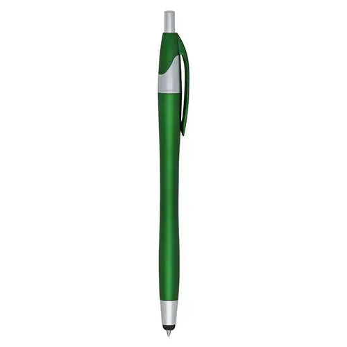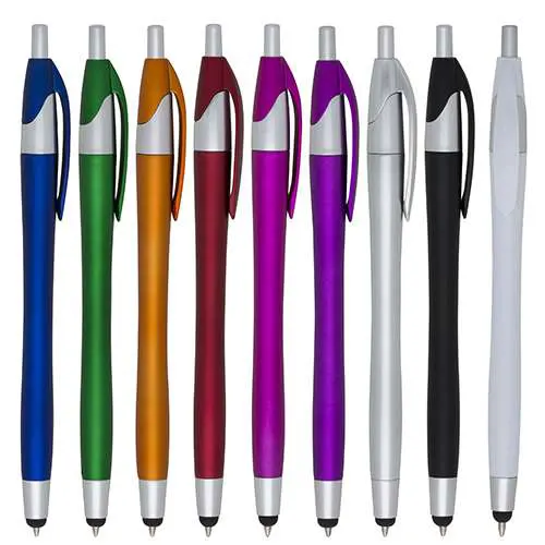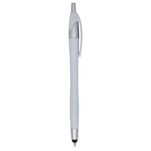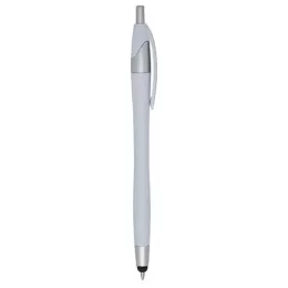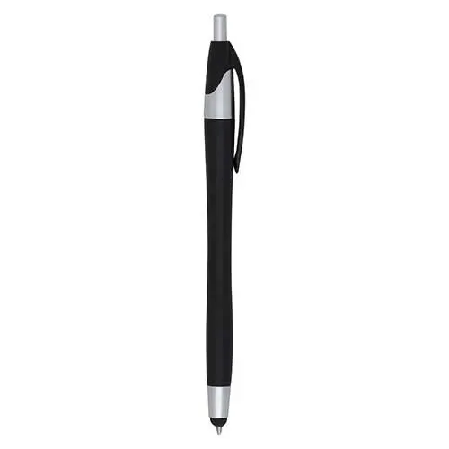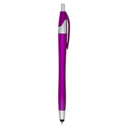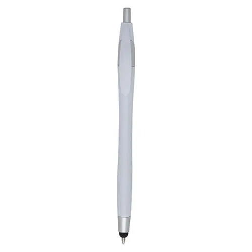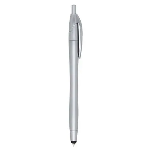 Caneta plástica com ponteira touch, inteira colorida com detalhes prata. Aciona por clique, ponteira sai através da borracha touch.