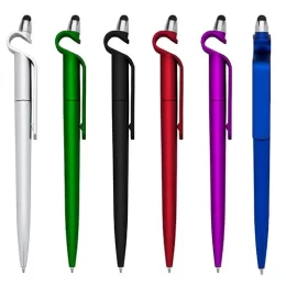 Descrição: Caneta plástica touch com suporte para celular. Aciona por rotação, carga esferográfica na cor azul.