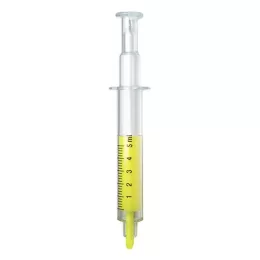 Descrição: Caneta plástica formato seringa, contém marca texto e carga esferográfica azul, ambas com tampas protetoras.