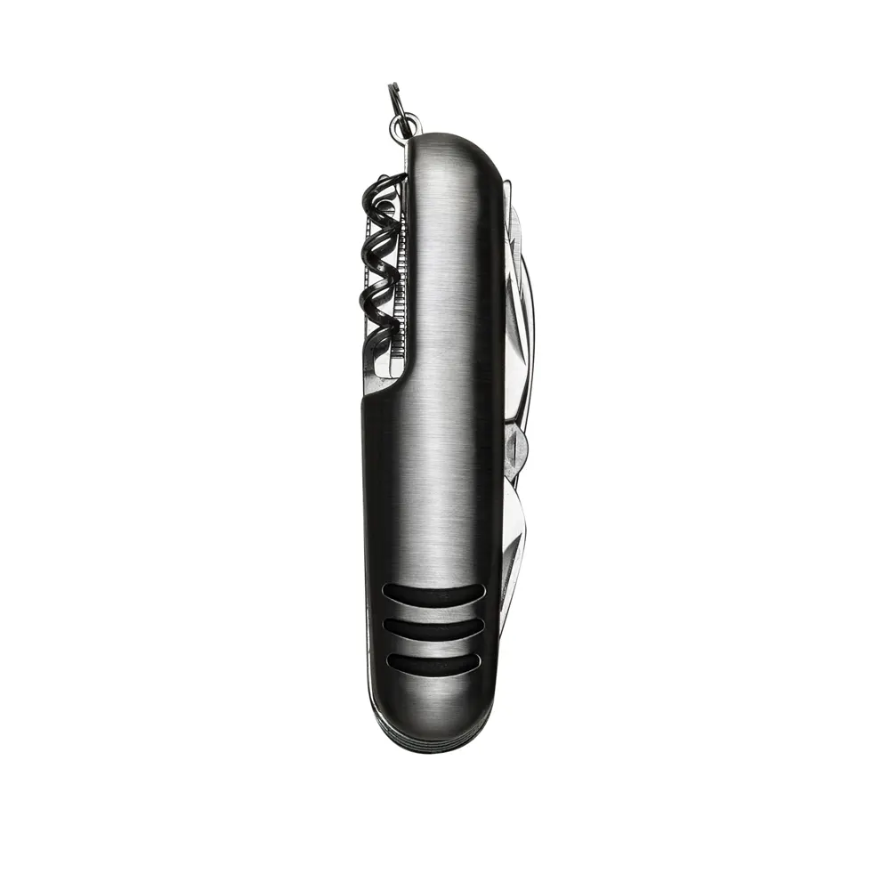 Descrição: Canivete metal 11 funções com detalhes emborrachados preto(três linhas frente e verso). Possui: lâmina de corte, serrilha, serra madeira, mini tesoura, abridor de latas, abridor de garrafa, chave phillips, lamina de remoção e limpeza, lixa, agulha de sutura e saca-rolhas. Acompanha bainha em nylon.