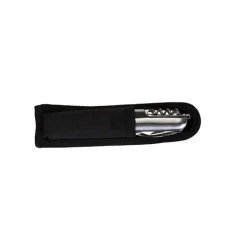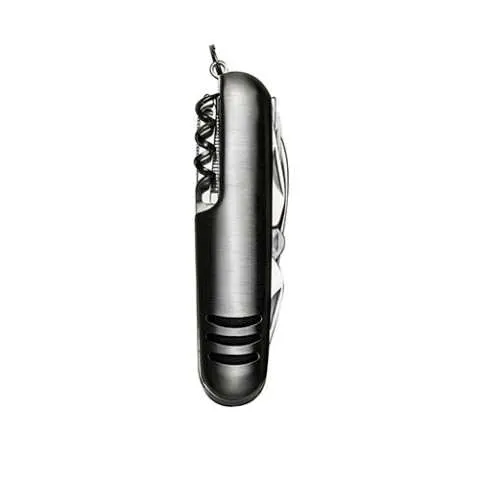 Canivete metal 11 funções com detalhes emborrachados preto(três linhas frente e verso). Possui: lâmina de corte, serrilha, serra madeira, mini tesoura, abridor de latas, abridor de garrafa, chave phillips, lamina de remoção e limpeza, lixa, agulha de sutura e saca rolhas. Acompanha bainha em nylon.