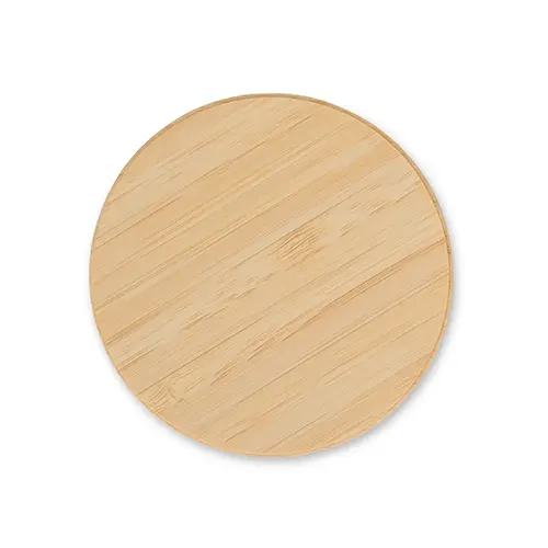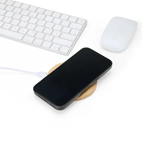 Carregador via indução formato disco com indicador de funcionamento em led, feito em Bambu. Compatível com smartphones com tecnologia por indução. Acompanha cabo USB. OBS.: O CARREGADOR APENAS TRANSFERE CARGA, ELE NÃO POSSUI BATERIA PARA ARMAZENAMENTO (NÃO É UM POWER BANK).