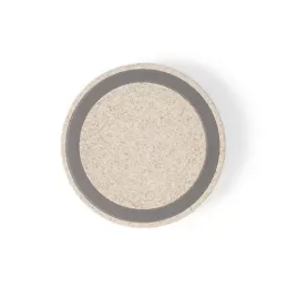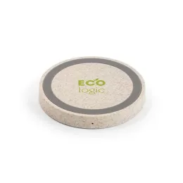 Carregador wireless em ABS e fibra de palha de trigo. A potência de carregamento é de 5W, com entrada 5V/2A. A base contém um círculo em silicone para o equipamento não se mova enquanto carrega. Incluso cabo micro USB de 1 m. Fornecido em caixa de papel kraft. ø70 x 10 mm