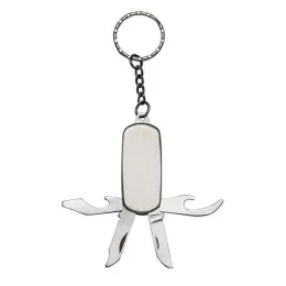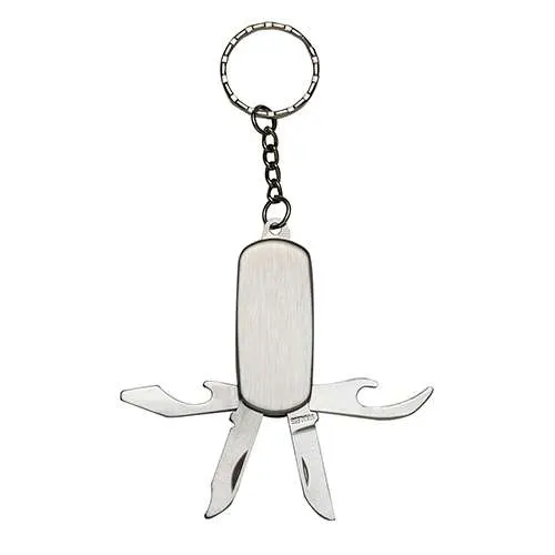 Chaveiro canivete 4 funções de metal liso (ambos lados). Possui: abridor de lata, lixa, lâmina de corte e abridor de garrafa.