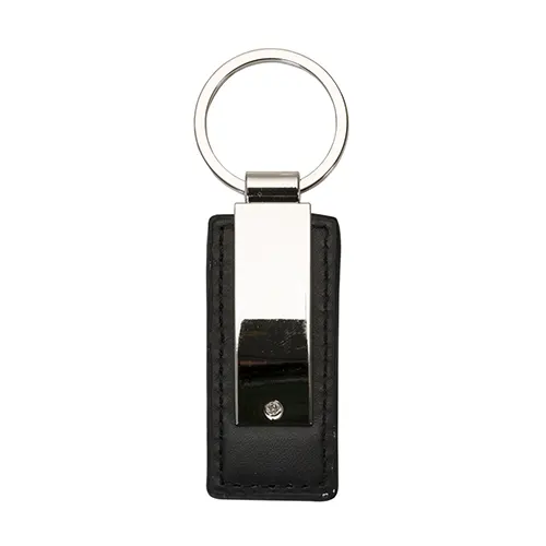 Descrição: Chaveiro metálico brilhante com detalhe em couro sintético, área frontal lisa e verso com parafuso.