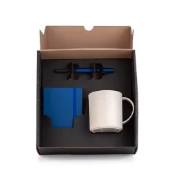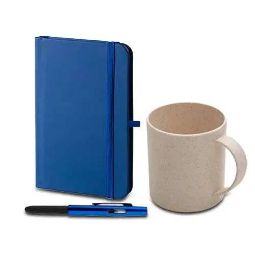Kit composto por caderno para anotações azul com capa dura, caneta esferográfica em ABS azul e caneca em fibra de bambu/PP.