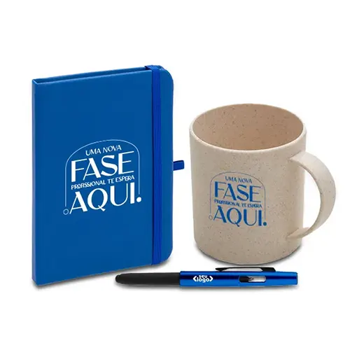 RECOMENDAÇÃO DE PERSONALIZAÇÃO: Uma gravação em Silkscreen na caneca, caderno e caneta.
