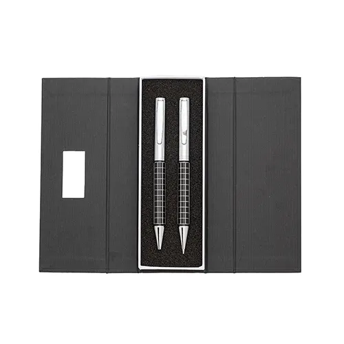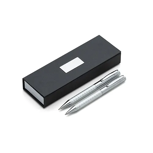 Descrição: Kit caneta e lapiseira de metal em estojo papelão com placa de metal(parte interna do estojo revestida com espuma). Caneta e lapiseira prata com detalhes coloridos e quadriculados, clip metal com anel superior na ponta e dois anéis centrais e acionam por giro.