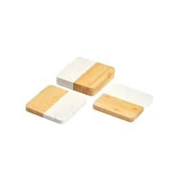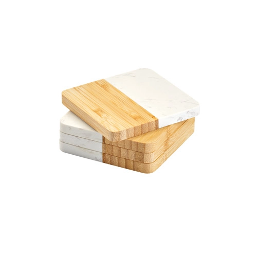 Conjunto de 4 porta copos em mármore e bambu em formato quadrado. Cada peça individual está dividida, pela sua metade, em mármore e bambu. Fornecido em caixa presente em papel kraft reciclado. Certificação EU Food Grade. A cor e o resultado da impressão nos materiais naturais pode variar entre produtos. 100 x 100 x 10 mm