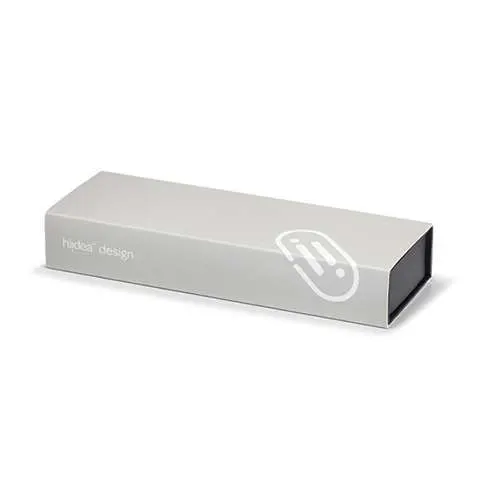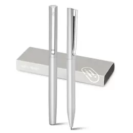 Conjunto de Roller e Esferográfica em Alumínio. Clipe em ferro com cromagem brilhante. Corpo laqueado com acabamento matt. Esferográfica com mecanismo twist e recarga em metal “tipo-Cross” com tinta Dokumental®. Roller com recarga em metal Premec. Roller: ø10 x 140 mm | Esferográfica: ø10 x 137 mm | Estojo premium: 183 x 64 x 30 mm