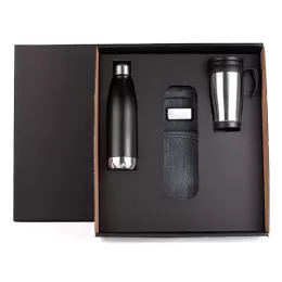 DESCRIÇÃO: Kit conta com mochila cinza em poliéster 300D Melange cinza, garrafa em aço Inox preta com tampa rosqueável e caneca em polipropileno preto revestida em aço inox escovado.
