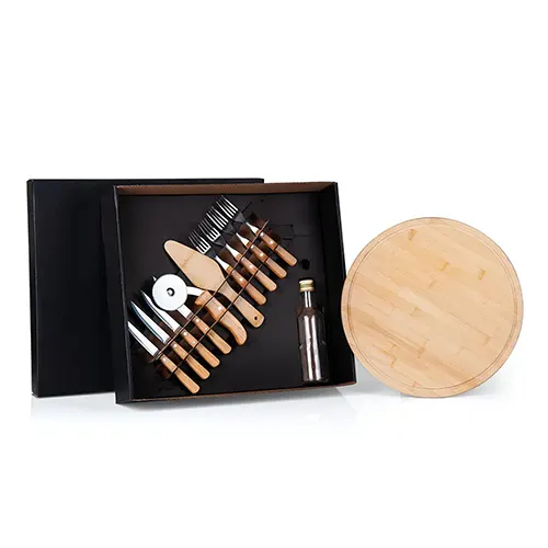 DESCRIÇÃO: Conjunto para Pizza em Bambu/Aço Inox. Acompanha tábua e espátula em Bambu; quatro facas de mesa, quatro garfos de mesa e cortador de Pizza em Bambu/Inox; garrafa com tampa.