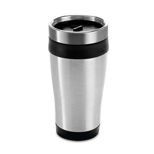 Copo para viagem. Aço inox e PP. Com corpo duplo e tampa. Capacidade até 420 ml. Food grade. Caixa branca 94654 vendida opcionalmente. ø81 x 167 mm