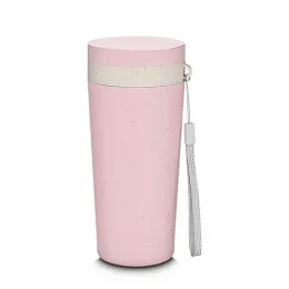 Copo plástico com parede dupla, produzido com fibra de trigo e plástico, com capacidade de 300ml, alça para transporte e tampa rosqueável.