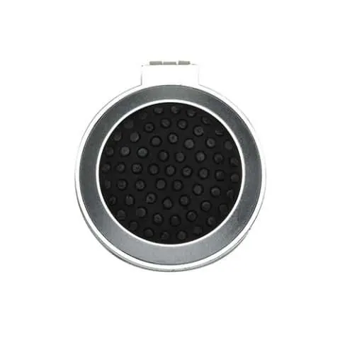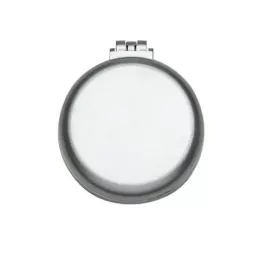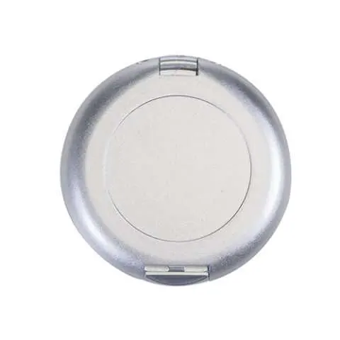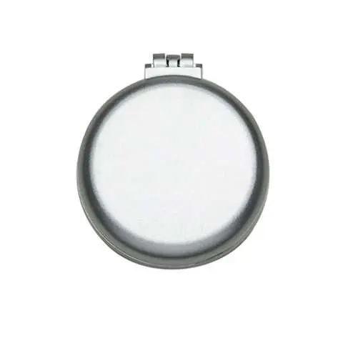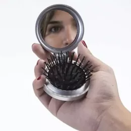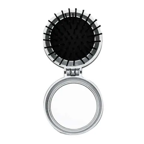 Escova com espelho redonda em plástico resistente. Parte superior plana e parte inferior emborracha com relevo, estando aberta a peça basta empurrar a parte emborrachada(lado de fora) para poder utilizar a escova.