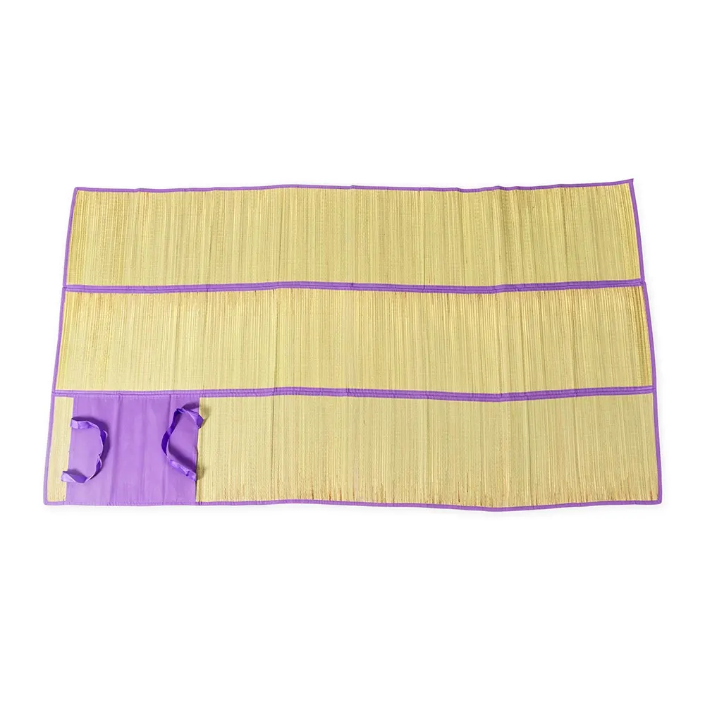 Descrição: Esteira leve em palha sintética com bordas costuradas em nylon. Acompanha saco de nylon com seção telada, cordão de fechamento e alça regulável para transporte.