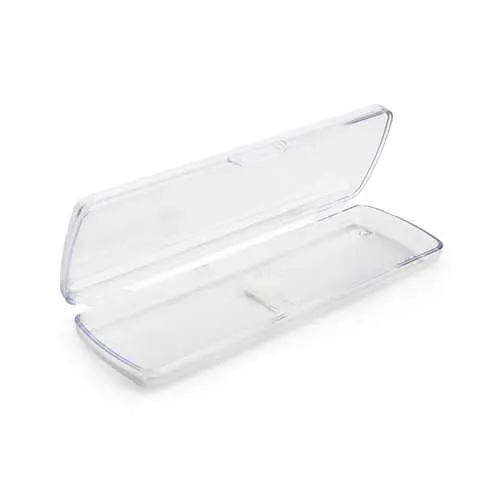 Estojo Acrílico 2872 para uma caneta com abertura superior, parte interna com suporte plástico para fixar a caneta.