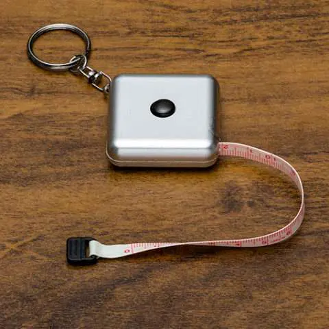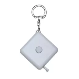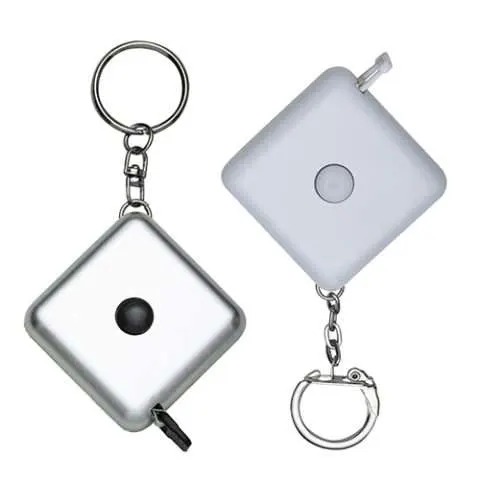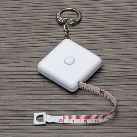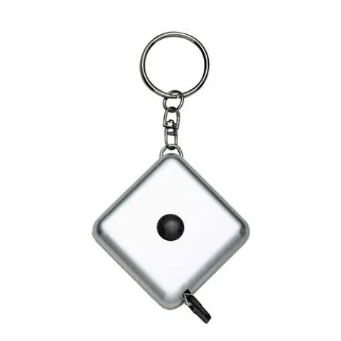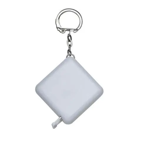 Fita métrica de 1 metro em plástico quadrangular, frente lisa e verso com botão(trava) preto. Acompanha chaveiro.