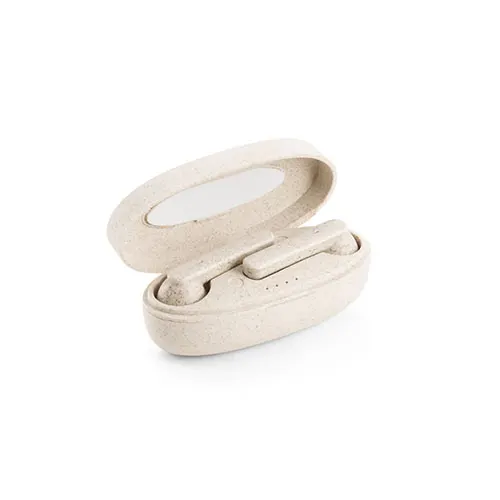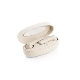 Fones de ouvido True Wireless em fibra de palha de trigo e PP, com transmissão por bluetooth 5.0 até 10m de distância e tempo de reprodução até 3 horas (standby até 10h). Cada fone tem um botão multifunções e microfone integrado, facilitando atender chamadas em modo mãos-livres, e indicador luminoso LED. O estojo de carregamento tem uma bateria de 300 mAh e indicador de status de carregamento e bateria. Incluso um cabo de carregamento micro USB. Produto fornecido em caixa de papel kraft. 80 x 38 x 32 mm
