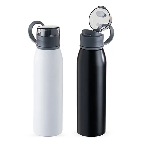 Descrição: Garrafa 650ml em inox. Tampa plástica rosqueável com proteção para o bocal e alça emborrachada para transporte