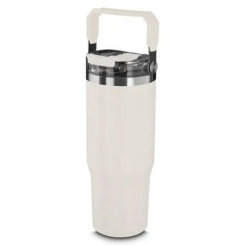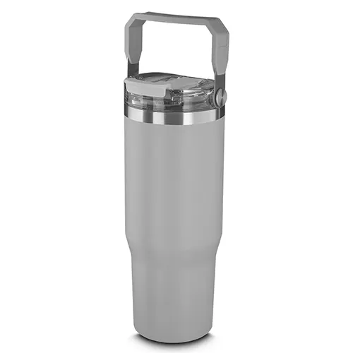 Garrafa térmica em aço inox com parede dupla com capacidade de 950ml parede externa com pintura a pó. Tampa rosqueável com e anel de silicone para vedação. Alça de transporte em plástico. Permite-se hidratar por canudo ou bico.