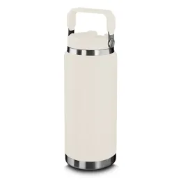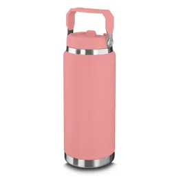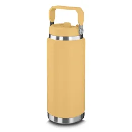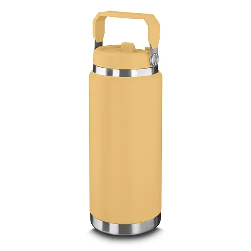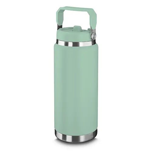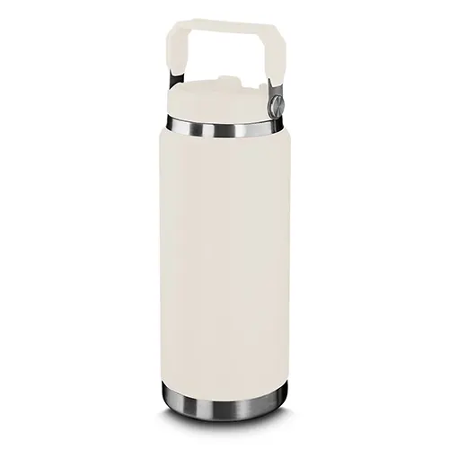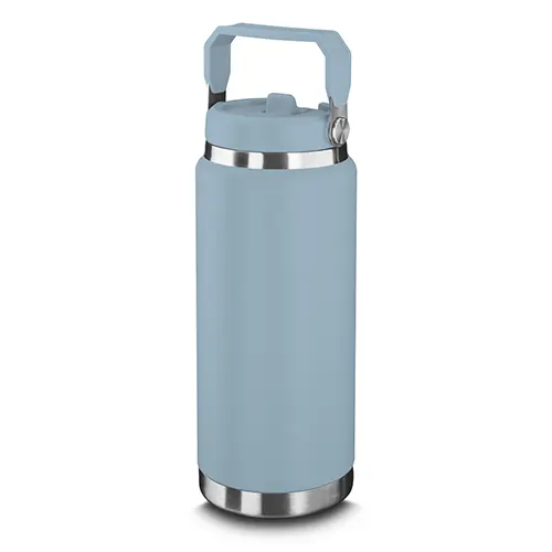 Garrafa térmica em aço inox com parede dupla com capacidade de até 900ml. Tampa rosqueável com anel de silicone para vedação. Alça de transporte em plástico. Permite-se hidratar pelo bico, com canudo. Pintura a pó.