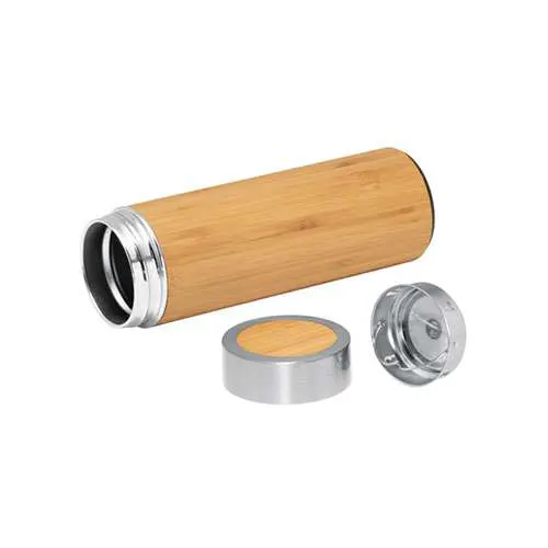 Garrafa térmica. Bambu e aço inox. Com parede dupla e infusor para chá. Capacidade até 430 ml. Fornecida em caixa presente. Food grade. ø69 x 207 mm | Caixa: 72 x 210 x 72 mm