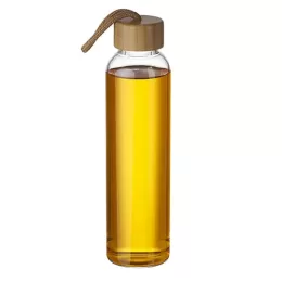 Descrição: Garrafa de vidro 600ml com tampa rosqueável de bambu e alça de tecido embutida.