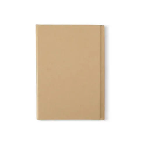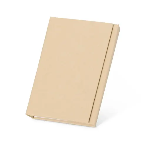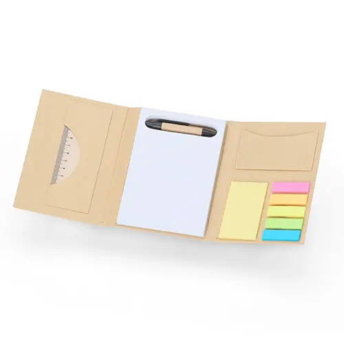 Bloco de Anotações Ecológico, material em kraft. Possui notas autoadesivas, aproximadamente 25 folhas, bloco autoadesivo amarelo com aproximadamente 25 folhas, compartimento para guardar anotações, uma régua em material plástico de 12 cm, caneta de papelão e bloco grande com aproximadamente 100 folhas.