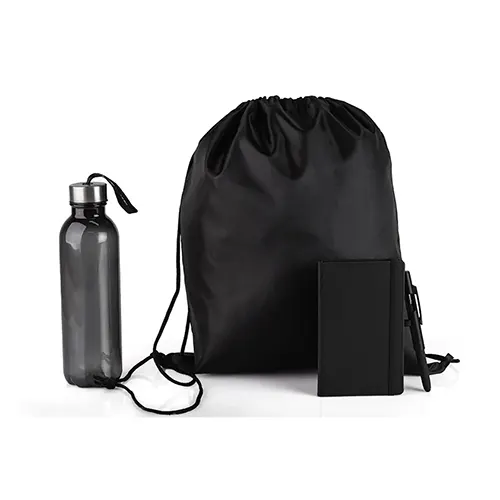 DESCRIÇÃO: Kit boas vindas. Conta com mochila preta em nylon 420, garrafa preta em pet, caderno para anotações preto com capa dura e caneta esferográfica em ABS preta.