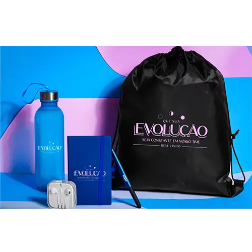 RECOMENDAÇÃO DE PERSONALIZAÇÃO: Uma gravação em Silkscreen na mochila, no caderno e na garrafa.