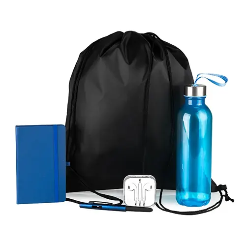 DESCRIÇÃO: Kit boas vindas. Conta com mochila em nylon 420, garrafa pet, fone de ouvido, caderno sem pauta e caneta esferográfica com tampa e ponta touch.