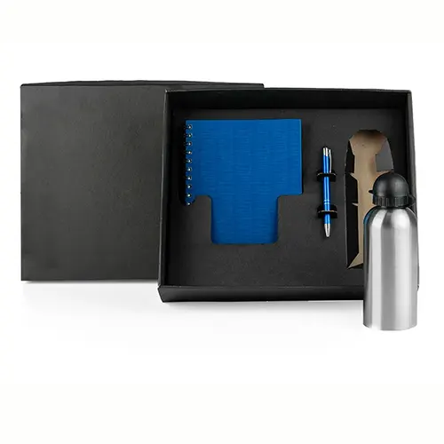 DESCRIÇÃO: Caderno para anotações wire-o azul com capa dura revestida em percalux linho, caneta esferográfica em alumínio azul e squeeze em aço inox com tampa rosqueável preta em polipropileno.