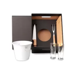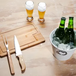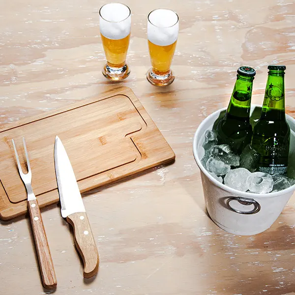 Uma gravação a Laser na tábua, nos copos, no balde e na lâmina da faca.
