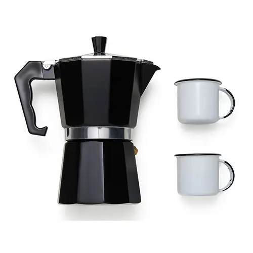 DESCRIÇÃO: Esse kit conta com cafeteira modelo Italiana em alumínio de alta qualidade e resistência. Toda sua estrutura é desmontável e alça para garantir a segurança durante o seu uso e conta também com duas canecas em alumínio branco.