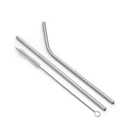 Descrição: Kit com 2 canudos de aço e 1 limpador. Contém canudo reto e canudo curvado de 215mm com detalhe superior de dez anéis, limpador com corpo de aço e ponteira plástica.
