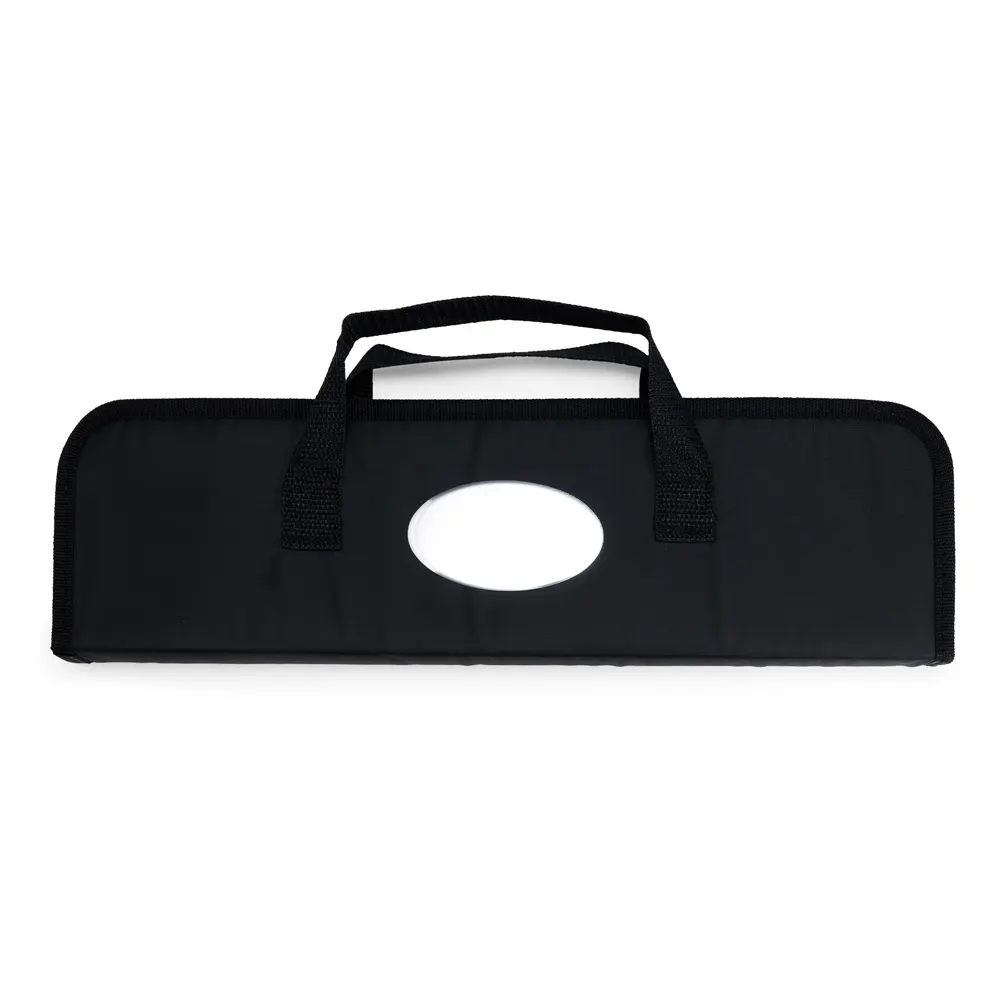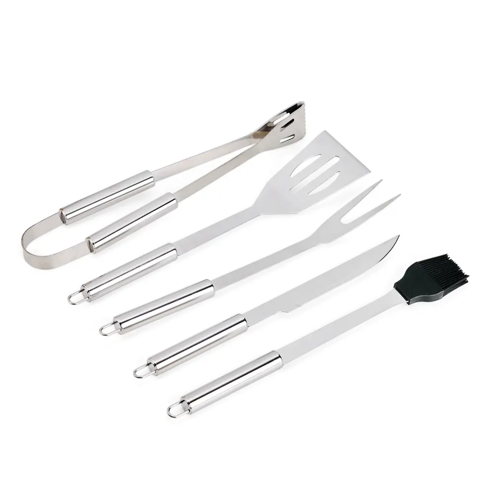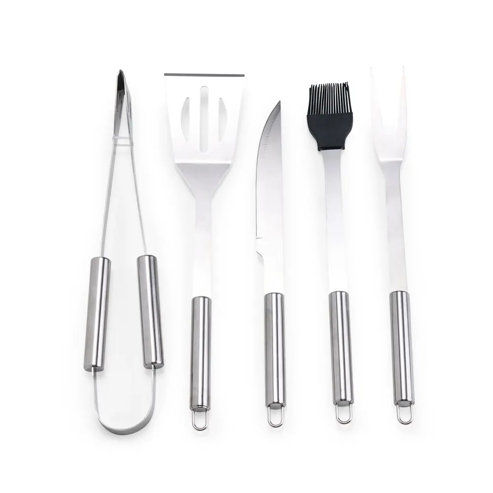 Descrição: Um kit ideal para acompanhar momentos de confraternização marcantes que apenas um bom churrasco pode proporcionar. O nosso kit traz 5 itens em aço inox indispensáveis para preparar um bom churrasco: 1 faca de 6,2 polegadas de lâmina, um garfo, 1 espátula, 1 pincel com cerdas de silicone e 1 pegador. Além disso, ele acompanha um estojo de nylon com um par de alças fixas para dar maior facilidade de transporte, além de uma placa metálica personalizável com verso autoadesivo.