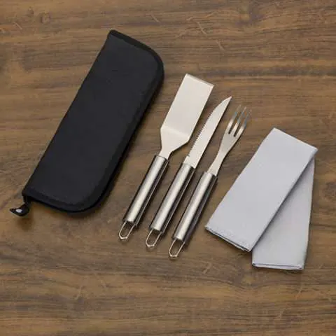 Kit churrasco com 5 peças em estojo de nylon com alça. Possui: 2 jogos americanos, espátula, faca e garfo. Acompanha proteções plásticas e parte interna com elástico para guardar as peças.