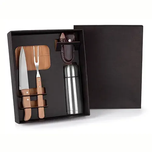 DESCRIÇÃO: Kit churrasco com canivete e garrafa. Conta com tábua para churrasco/cozinha em bambu, garrafa em aço inox escovado, faca 7″ em madeira/inox, garfo em madeira/inox e canivete.