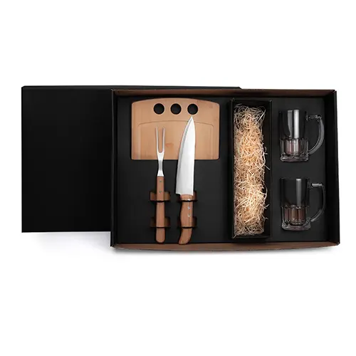 DESCRIÇÃO: Conjunto para churrasco/cerveja. Acompanha tábua com três furos em bambu; faca 8” e garfo em bambu/inox; duas canecas para cerveja/chopp em vidro e espaço para garrafa com palha (NÃO ACOMPANHA GARRAFA). Como cortesia, na faca 8″ fazemos uma gravação com os cortes do boi.