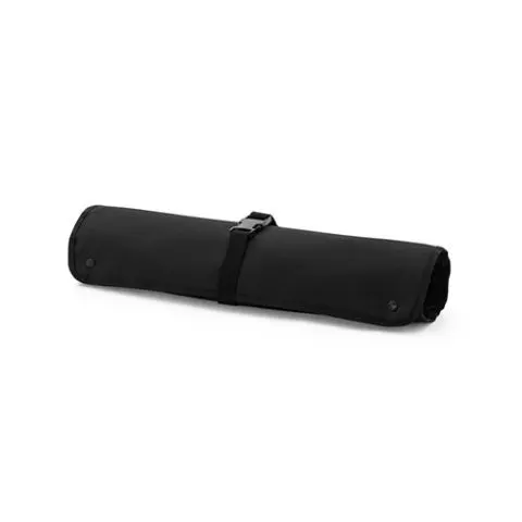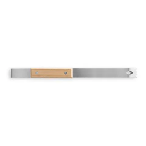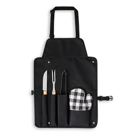Kit churrasco composto por 4 utensílios: faca, garfo e pinça em aço inox e madeira de Seringueira e uma luva de cozinha. O estojo dobrável em 600D pode ser convertível em avental para sua proteção. Próprio para contato com alimento. Dobrado e fechado: 130 x 480 mm