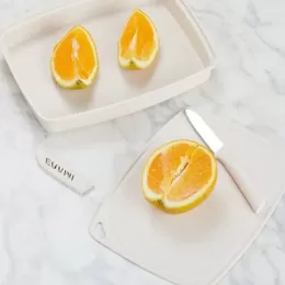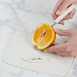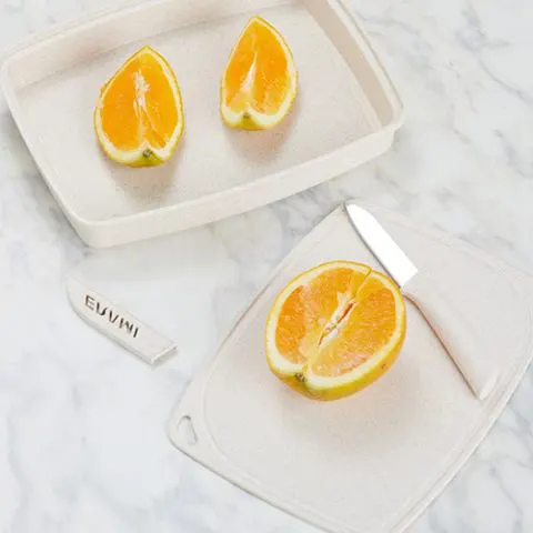 Descrição: Kit Cozinha 3 Peças em plástico de palha de trigo e inox. Contém tesoura culinária, faca com protetor e descascador de legumes. Acompanha bandeja e tampa, podendo ser utilizada como recipiente e tábua para corte.